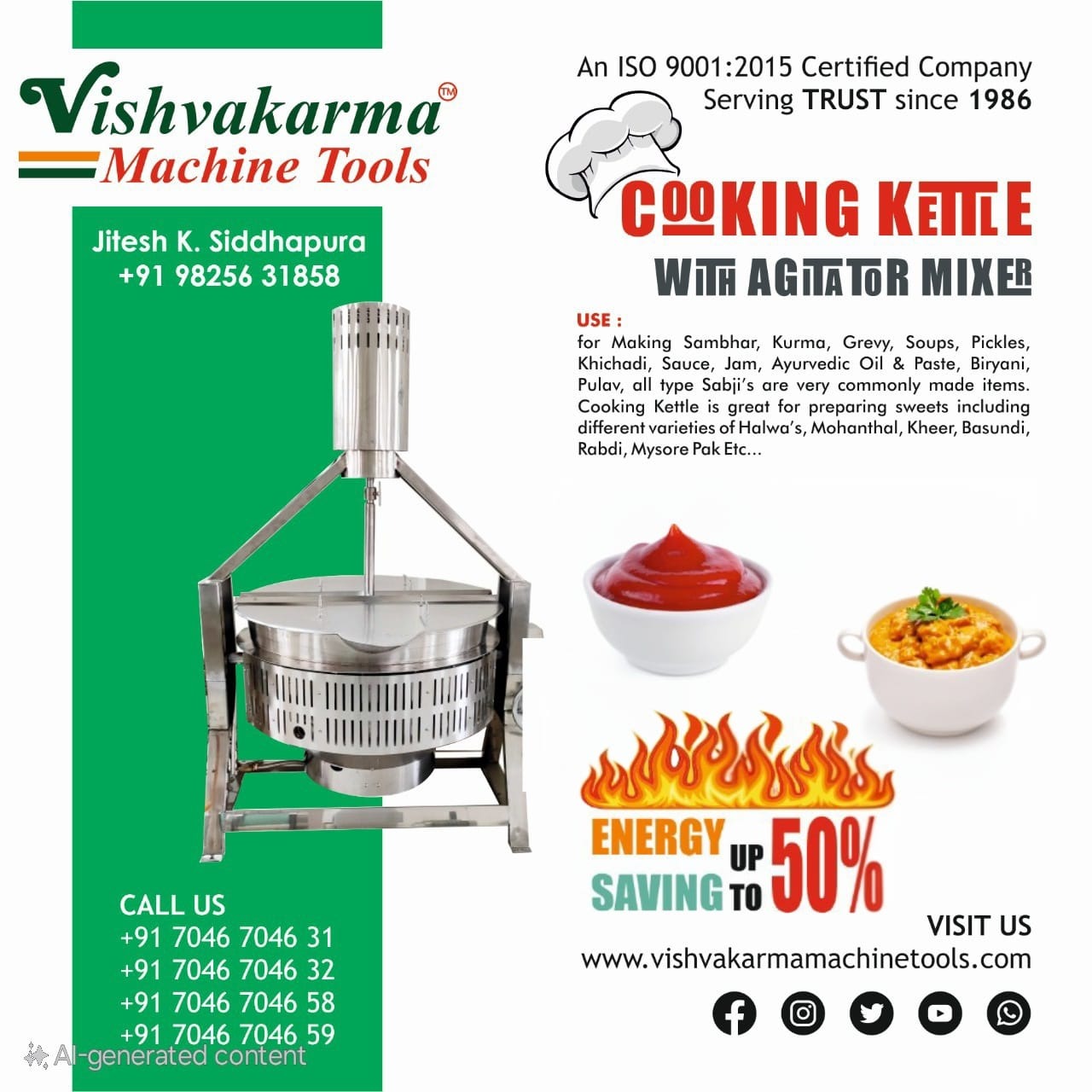 Vishvakarma Machine Tools offers a premium Industrial Cooking Kettle with Mixer in Mumbai, ideal for bulk food preparation. This gas-operated kettle is designed to save up to 50% gas energy, making it perfect for commercial kitchens, food factories, and catering businesses. With uniform mixing and fast heating, it ensures efficient and hygienic cooking. Built with high-quality materials, it offers long-lasting performance and low maintenance. Upgrade your kitchen with our bulk cooking machine and experience maximum energy savings and productivity. Available now across Mumbai and Maharashtra.